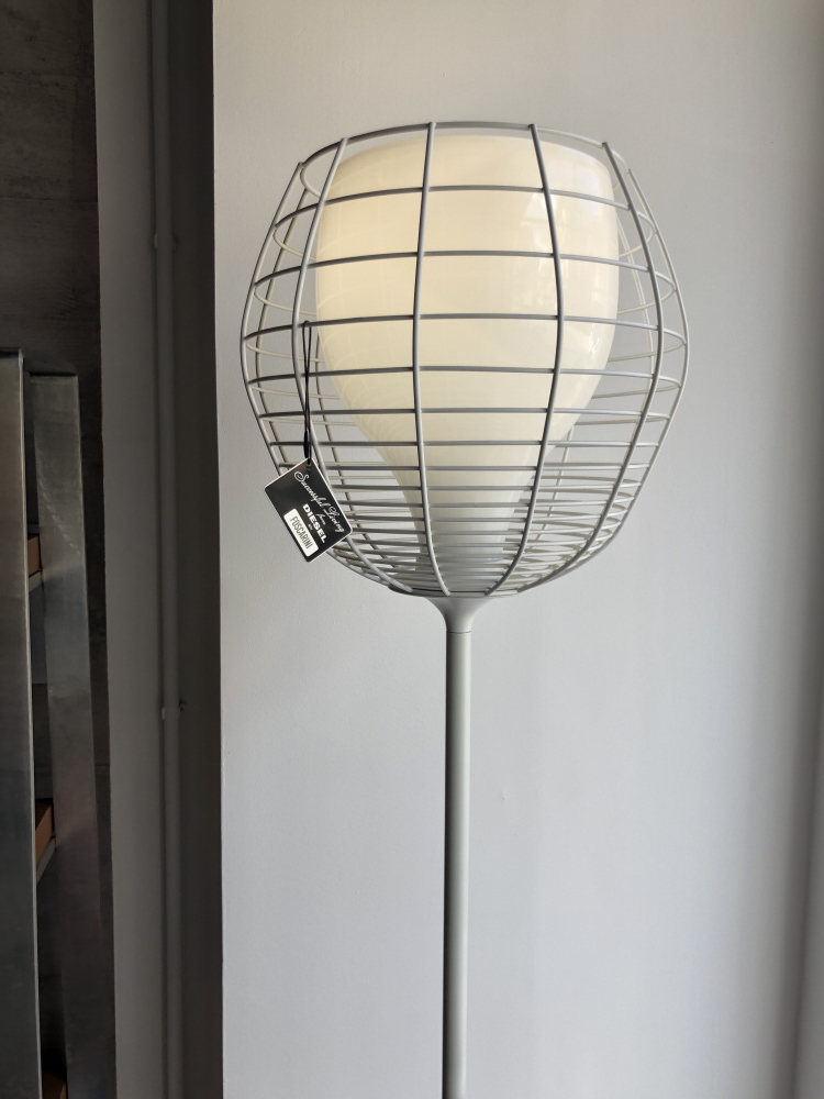 Appoggiata alla base bianca, “Cage Mic” ricorda un microfono e richiama il mondo della musica. H 44 cm – Paralume: L 12 Ø 17 Base Ø 15 Cavo L 210cm.